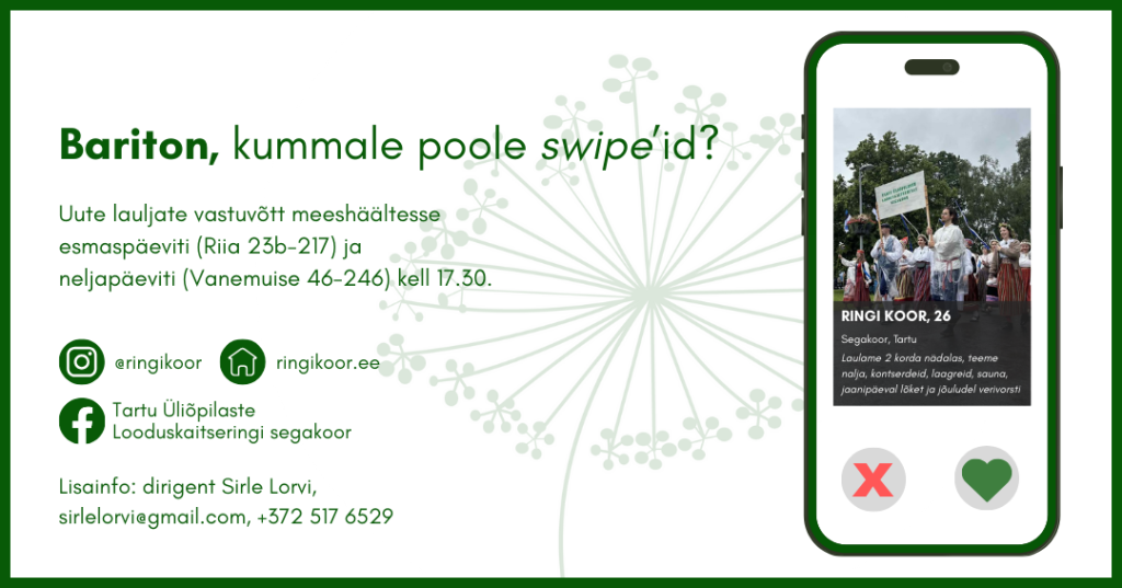 Tänane ilmateade: vihm uhub grillsöed märjaks ja tuul puhub isegi liha grilli pealt minema! Looduse vastu pole mõtet võidelda, las ta möllab. Tule parem tuppa, Ringikoori kevadkontserti nautima! Soe jook näppu ja mõnus hõlst ümber. Kui Tartu Loomemajanduskeskuse saali ei jõua, siis Internetis, kell 18:00.